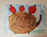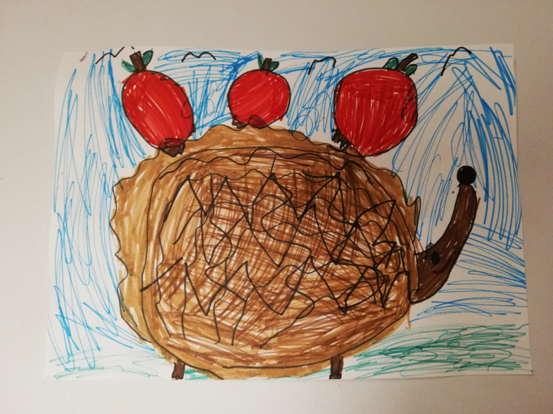 Ježek se připravuje na podzim a nese si jablíčka do domečku.